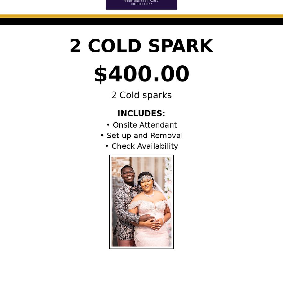 Light up your celebration with 2 spectacular cold spark fountains! Safe, stunning visual effects for your special moments. Package Includes: - 2 Cold sparks - Onsite Attendant - Set up and Removal - Check Availability Contact us after purchase to schedule your event date and discuss setup details.